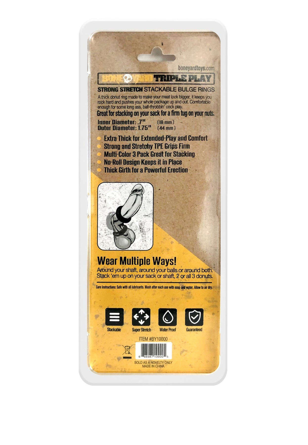 Extra thick and comfortable the D-Ring X3 contains the 3 perfect size donut rings.  Each kit contains a black, clear, and smoke colored ring, intended to be worn around cock, balls or both.  They are made of super strong and stretchy TPE and are phthalate free.  The D-Ring X3 are soft, stretchy, easy to get on, and help you keep a firm and hard erection.
